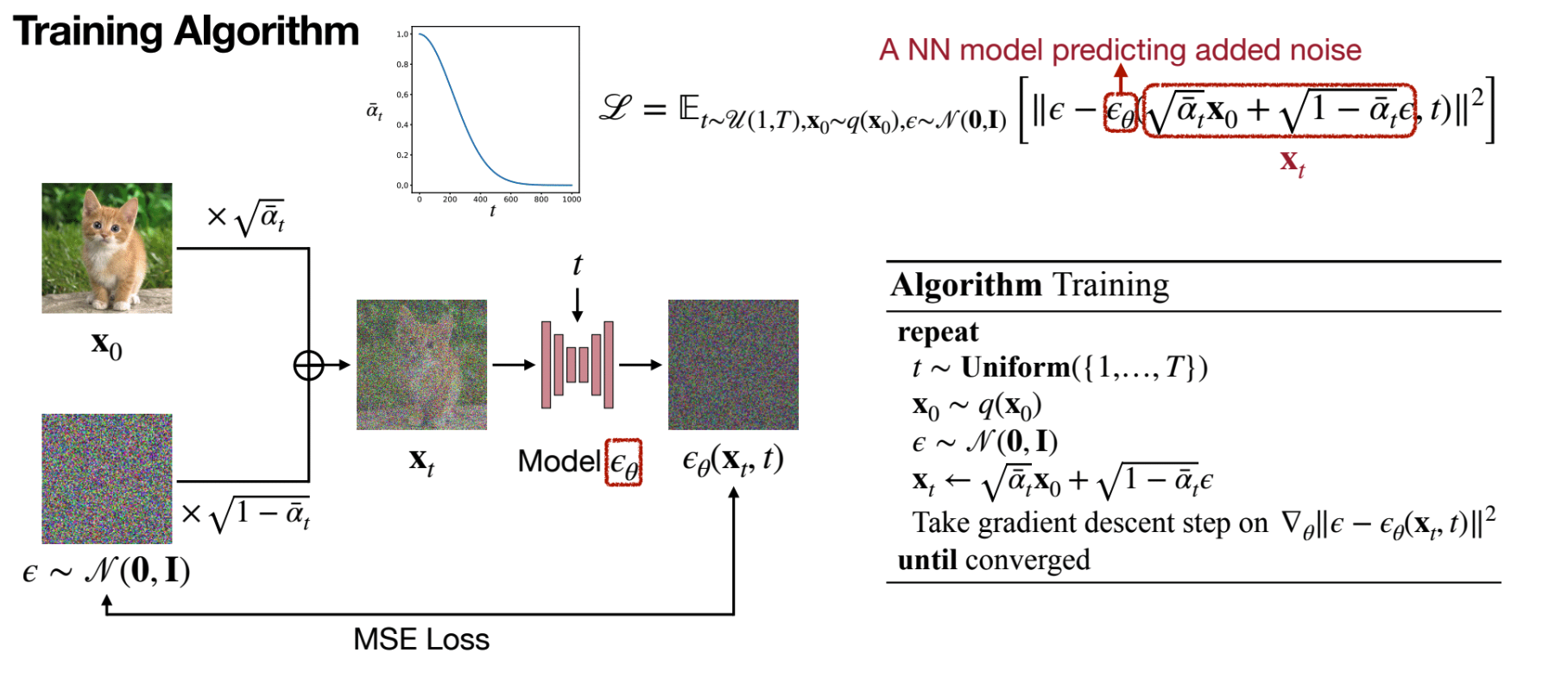 最大似然估计,损失函数为 MSE,训练目标为预测高斯噪声。